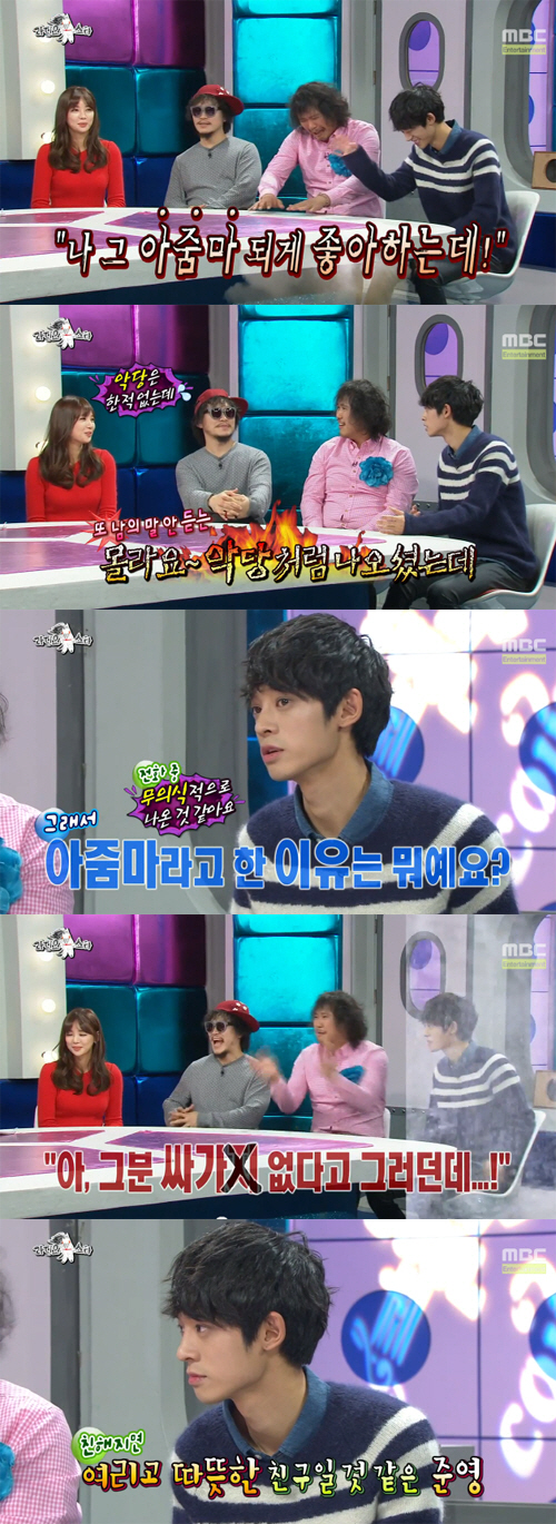 이태임은 "그냥 주위에 여쭤보니까 '싸가지 없는 친구'라고 하더라"며 "오늘 보니까 그런 느낌이 없지 않아 있는 거 같다"고 농담했다. 하지만 이내 이태임은 "정준영은 친해지면 여리고 따뜻한 친구일 거 같다"고 말했다.