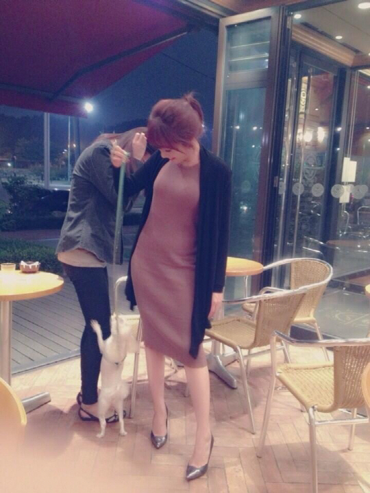 사진 속에는 지인의 다리에 매달려 있는 하얀색 강아지의 목줄을 잡은 채 환한 미소를 짓고 있는 김혜선의 모습이 담겨있다.