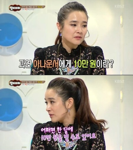 이날 김보민은 "아나운서에게 10만원이란 무엇이냐"라는 질문에 대해 "어쩌면 아나운서에게 10만원은 한 달 월급이 될 수 있다"며 "프로그램 1편에 출연해 5000~6000원 벌면 '커피 값 벌었구나' 라는 생각이 든다"라고 고백했다.