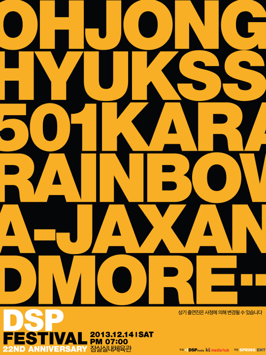 카라, 레인보우, 오종혁, 에이젝스 등이 소속된 DSP미디어의 첫 자사 패밀리 콘서트인 'DSP 페스티벌 (DSP Festival)'이 오는 12월 14일 잠실실내체육관에서 열린다. 이에 앞선 1일 오전, DSP미디어는 DSP 공식 홈페이지와 공식 SNS를 통해 콘서트 티져 이미지를 공개했다.