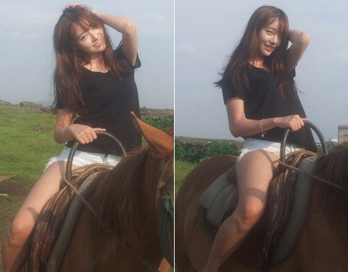 공개된 사진 속 천이슬은 검은색 반팔 티셔츠에 핫팬츠를 입은 캐주얼한 패션으로 말 위에 올라타 있는 모습. 카메라를 향해 환한 미소를 지어보인 그녀는 탄탄한 허벅지와 각선미를 자랑하며 빼어난 미모를 뽐내 시선을 모은다.