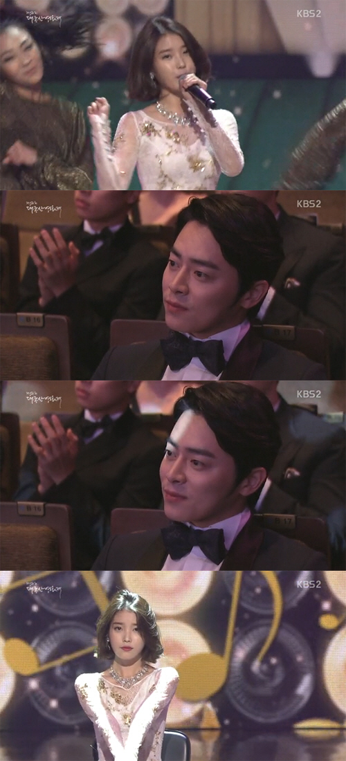 이날 아이유는 최근 변신한 단발머리로 무대에 올랐다. 뛰어난 가창력과 화려한 안무로 무대를 꾸미는 아이유의 모습과 함께 화면에는 객석에 있는 조정석의 모습이 잡혔다.