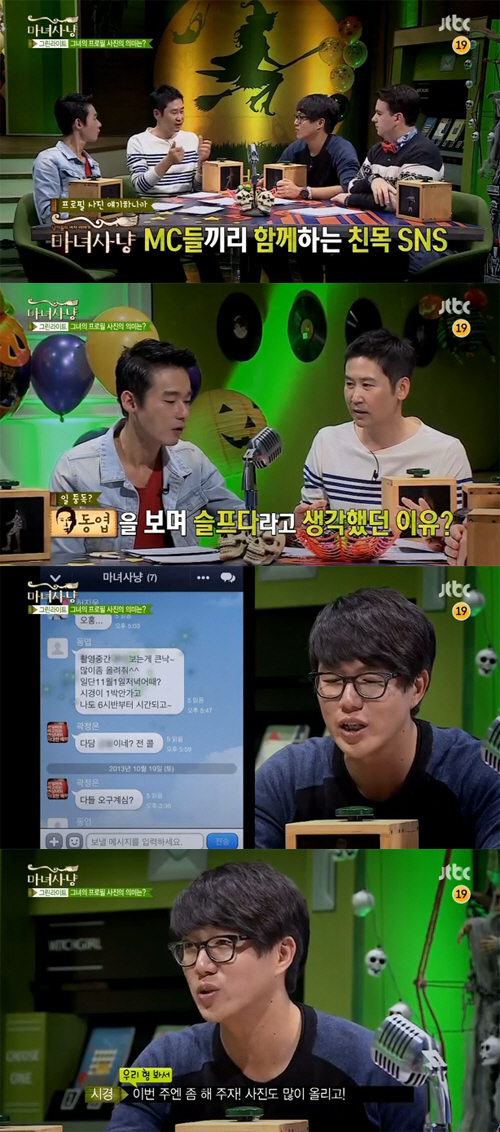 이와 함께 '마녀사냥' MC들이 나눈 SNS가 공개됐다. 신동엽이 다른 MC들에게 '촬영 중간에 보는 게 큰 낙~ 많이 좀 올려줘'라는 메시지를 보낸 게 화면에 잡혔다.
