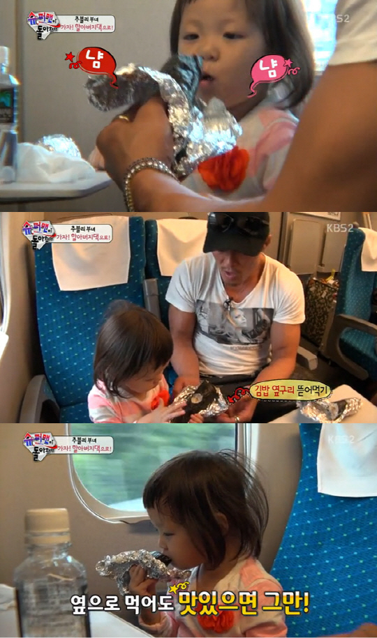 열차에 올라탄 추성훈은 아내 야노 미호가 싸준 김밥을 추사랑에게 건넸고, 추사랑은 자신의 입보다 큰 김밥을 특이하게도 김밥을 옆구리부터 뜯어 먹으며 먹방을 선보여 눈길을 끌었다.