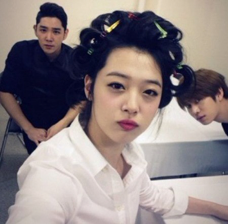 공개된 사진에는 설리를 중심으로 강인과 김희철이 카메라를 향해 고개를 내밀고 있으며, 특히 설리는 헤어스타일을 연출하고 있는 도중임에도 불구하고 완벽한 미모를 뽐내고 있어 눈길을 끈다.