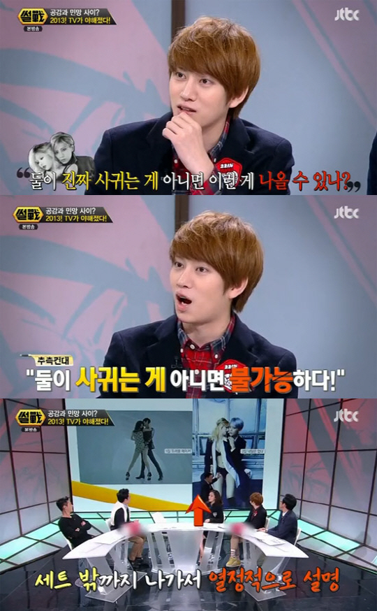 그러나 김희철은 "둘과 안 친해서 잘 모른다. 아이돌 선배의 시선으로 봤을 때 '둘이 사귀지 않으면 저렇게 나올 수 있나'라는 생각이 들었다. 나 같은 경우에는 여자 친구와 이런 영상을 찍으면 100% 편하게 찍을 수 있다"고 말해 눈길을 끌었다.