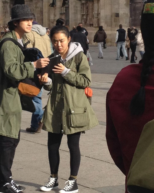 사진에는 현재 유럽 여행 중인 문근영과 김범의 모습이 담겨 있다. 올림머리로 동안 미모를 뽐낸 문근영과 모자로 패션감각을 자랑한 김범은 나란히 서서 태블릿 PC를 들고 무언가를 열심히 찾고 있다. 카키색 야상점퍼에 백팩으로 은근한 커플룩을 선보인 두 사람은 여느 대학생 커플처럼 풋풋한 모습으로 눈길을 끈다.