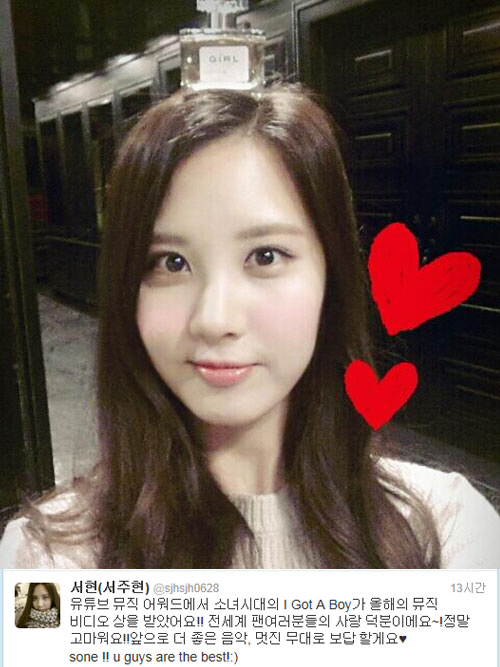 서현은 "유튜브 뮤직 어워드에서 소녀시대의 'I Got A Boy'가 올해의 뮤직비디오 상을 받았어요! 전 세계 팬 여러분들의 사랑 덕분이에요~! 정말 고마워요! 앞으로 더 좋은 음악, 멋진 무대로 보답할게요"라는 글과 함께 한 장의 사진을 덧붙였다.