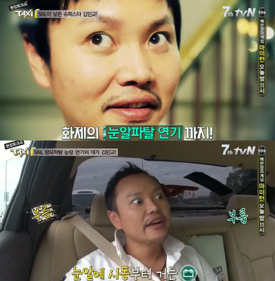 김민교는 자신이 출연 중인 'SNL 코리아'에서 눈을 크게 부릅뜨는, 일명 '눈알연기'를 선보이며 시청자들에게 큰 웃음을 선사했다. MC 홍은희는 이날 '택시'에서 '눈알연기'를 뽐낸 김민교에게 "흰자가 이렇게 많이 보이는 줄 몰랐다"고 말하며 웃음보를 터트렸다.