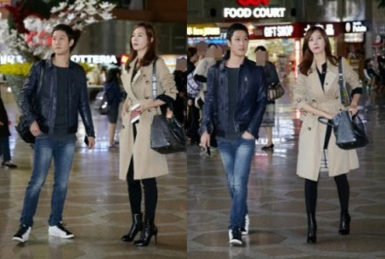 공개된 공항 출국 사진에는 트렌치 코트로 세련된 스타일을 선보인 김유미와 청바지에 가죽 점퍼를 입은 편안한 차림의 정우의 모습이 담겨 있다.