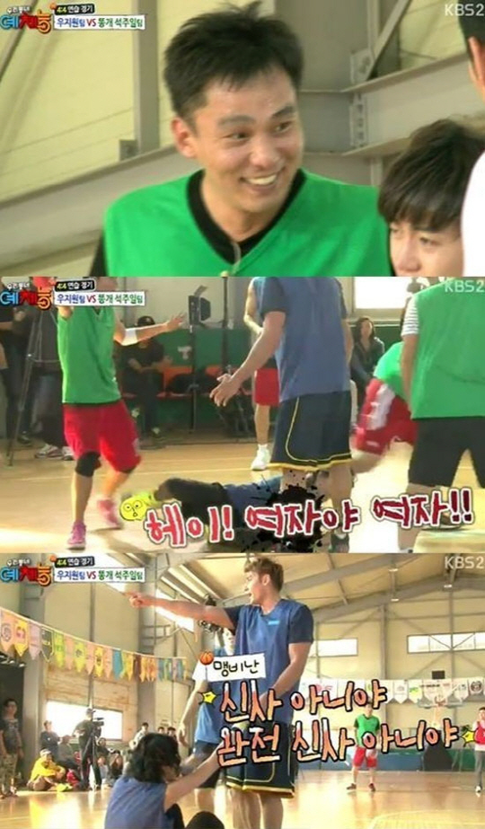 그러나 아랑곳 하지 않고 계속해서 '똥개 농구'를 이어가는 석주일의 모습에 멤버들은 "신사가 아니다"라며 비난을 퍼부었다.