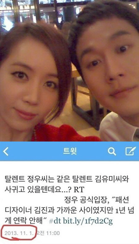 최근 온라인 커뮤니티 게시판에는 정우와 지난 5일 김유미의 열애사실이 공개되기 전, 이미 두 사람이 사귀고 있다는 글을 캡처한 사진이 게재됐다.