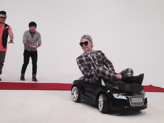 사진에는 체크무늬 정장을 차려입은 지드래곤이 장난기 넘치는 표정으로 검은색 장난감 차를 타고 여유를 부리는 모습이 담겨 있다. 그의 뒤에는 MC 정형돈과 데프콘이 장난감 차에 올라탄 지드래곤을 걱정스러운 눈빛으로 바라보고 있는 모습이 포착돼 웃음을 자아낸다.