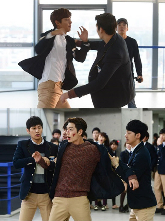 공개된 사진에는 이민호와 김우빈이 격렬한 몸싸움을 벌이고 있다. 많은 아이들이 지켜보고 잇지만 말리는 이들의 제지에도 아랑 곳 없는 팽팽한 대치 상황을 이루고 있다.