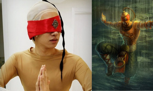사진 속 김희철은 특유의 문양이 새겨진 빨간 두건으로 눈을 가리고 변발처럼 보이는 가발과 살색 티셔츠를 착용한 채 리신으로 완벽 변신한 모습. 특히 그는 합장 자세를 취하는 코믹한 모습으로 웃음을 자아낸다.