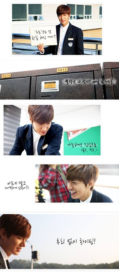 공개된 사진 속 이민호는 SBS 수목드라마 '상속자들' 속의 김탄의 모습을 한 채 "수능 보는 건 확실해진 거야?"라고 쓰여 있는 스케치북을 들고 응원의 메시지를 전하고 있다.