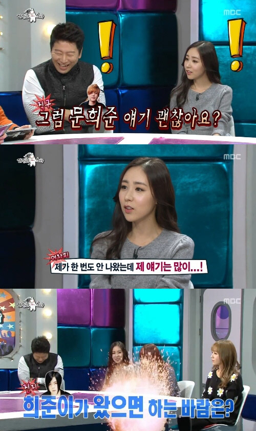 간미연은 6일 방송된 MBC '황금어장-라디오스타'에서 "내 얘기 할 게 없을 거다"고 말했고, 이에 MC들은 의아해하며 "문희준 얘기 괜찮나?"라고 돌직구로 물었다.