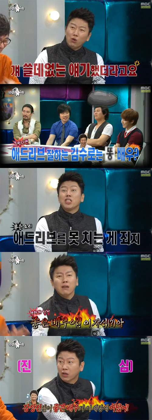 이에 대해 김수로는 "급이 아닌데 날 건드렸다. 애드리브를 못 치는 게 죄지 잘 치는 게 죄냐. 어디다대고 걔는 참 신기하다"며 발끈했다. 이어 "내가 더 심한 얘기를 하는데 어머니가 보고 아파하실까 봐 말을 못하겠다. 본인만 아픈 게 아니라 가족들이 아파한다"며 "강성진 좋은 배우야 이 자식아. 강성진같이 좋은 배우가 어딨냐"며 흥분해 폭소케 했다.