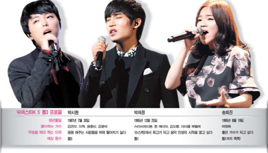 무려 198만명이 응시한 대국민 오디션 '슈퍼스타K 5'(Mnet)가 어느덧 단 3명의 생존자만 남겨두고 있다. 톱3는 '제2의 허각'으로 불리는 박시환, 로이킴-존박을 연상케 하는 박재정 그리고 역대 최고의 음역대로 여성 최초 우승을 노리는 송희진.