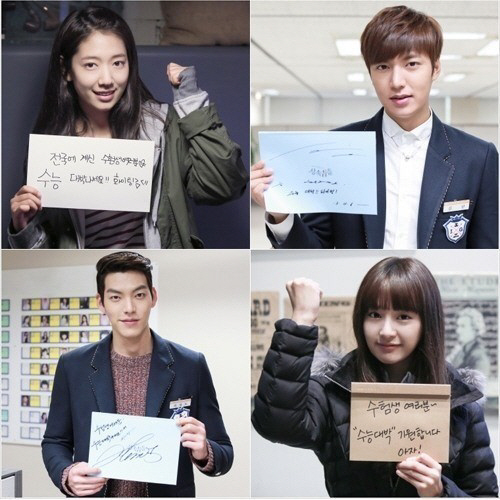극 중 고등학생 역할을 맡고 있는 이들은 자필로 쓴 응원 메시지를 들고 파이팅을 외치고 있다.