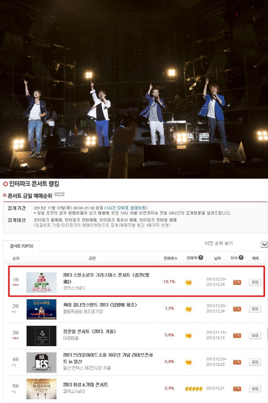 지난 7일 오후 8시, 인터파크를 통해 티켓예매를 시작한 스윗 소로우 콘서트 '설전(雪戰)'이 티켓 오픈 직후 예매율 1위를 기록하며 막강한 티켓 파워를 과시한 것.