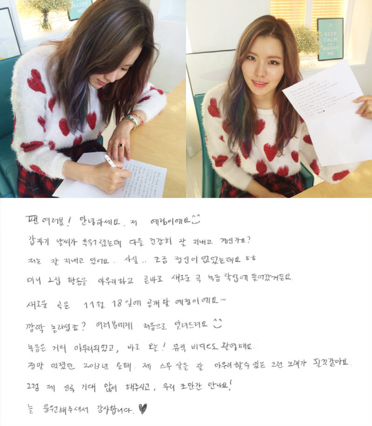 김예림의 소속사 미스틱89 측은 8일 김예림의 공식 페이스북에 김예림이 직접 쓴 손편지와 함께 편지를 쓰는 모습을 담은 인증 사진을 공개했다. 김예림의 손편지에는 올 한 해 자신을 사랑해준 팬들을 향한 감사 인사와 11월 18일에 신곡을 발표한다는 소식이 담겨 있다.