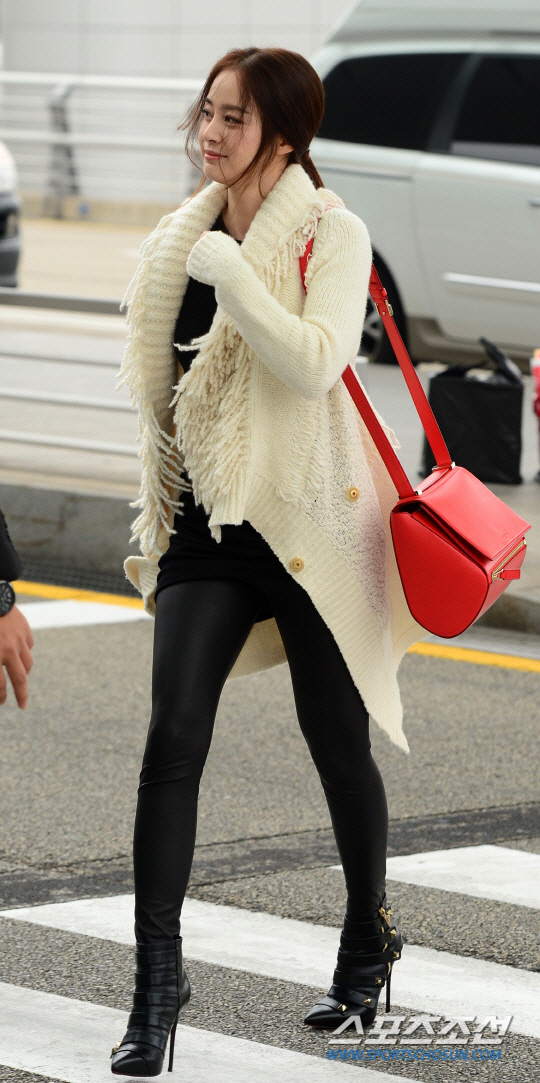 롱 니트 가디건에 블랙 앵글부츠와 레드 숄더백으로 여성스러우면서도 시크한 분위기를 발산한 그녀는 특히 몸매가 드러나는 가죽 레깅스로 우월한 각선미를 뽐내 눈길을 끌었다.