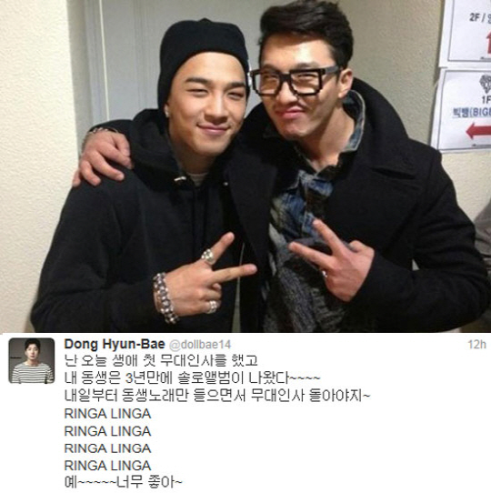빅뱅 멤버 태양의 솔로 앨범 컴백에 친형이자 배우인 동현배가 응원의 메시지를 보냈다.