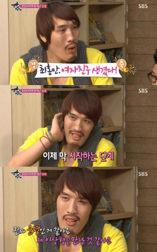 최홍만은 "여자친구와 이제 막 시작하는 단계다"며 "현도 형님 때문에 만나게 됐다. 첫 느낌이 정말 좋았고 지금까지도 설레고 항상 생각나서 잠을 못 자고 있다"고 여자 친구에 대한 애정을 드러냈다.