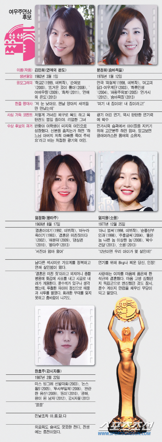 올해 성적표를 본다면 부일영화상에서 여우주연상을 받은 한효주와 대종상영화제에서 여우주연상을 수상한 엄정화가 조금 앞선 형세다. 그러나 앞선 시상식에서는 다른 후보들은 노미네이트되지 않았기에 쉽게 결과를 예측하기 어렵다. 오히려 이번 시상식이 진정한 승부처가 될 거란 평가도 많다.