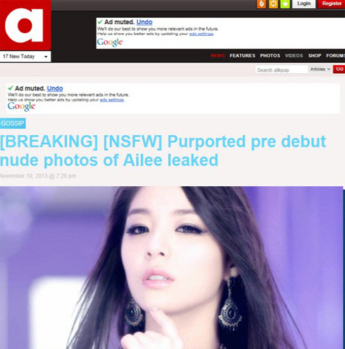 한편 지난 10일 영어권의 최대 한류 연예정보 사이트 '올케이팝'은 에일리의 누드 사진을 공개했다. 이후 에일리 소속사측은 "온라인상에 유포된 에일리의 누드사진은 유명 속옷 모델 캐스팅 제의를 받아 사기를 당한 것이다"며 해명했다. <스포츠조선닷컴>