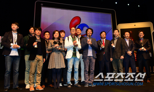 13일 오후 부산광역시 영화의전당에서 '2013 대한민국 게임대상'(스포츠조선-문화체육관광부-전자신문 공동 주최) 시상식이 열렸다. 대상을 차지한 아키에이지 엑스엘게임즈 송재경 대표와 각 부문 수상자들이 함께 기념 포즈를 취하고 있다.