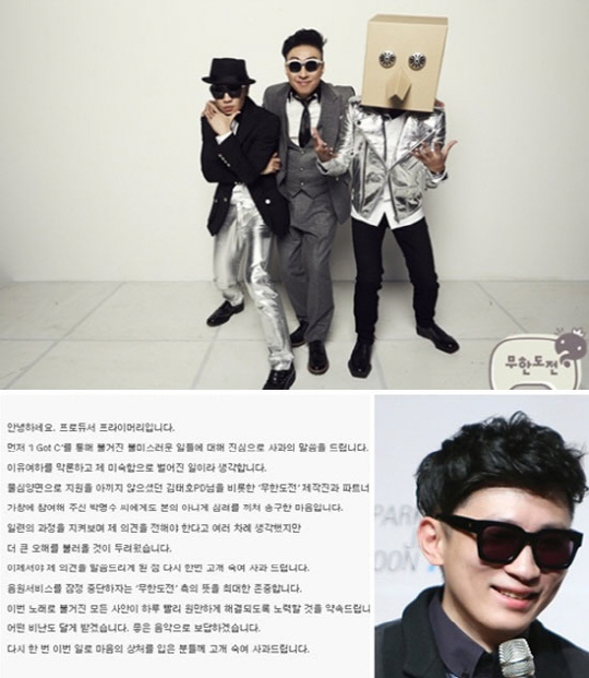 그는 "물심양면으로 지원을 아끼지 않으셨던 김태호 PD님을 비롯한 '무한도전' 제작진과 파트너로 가창에 참여해 주신 박명수 씨에게도 본의 아니게 심려를 끼쳐 송구한 마음"이라며 "일련의 과정을 지켜보며 제 의견을 전해야 한다고 여러 차례 생각했지만 더 큰 오해를 불러올 것이 두려웠다. 이제야 제 의견을 말씀드리게 된 점 다시 한 번 고개 숙여 사과드린다"고 털어놨다.