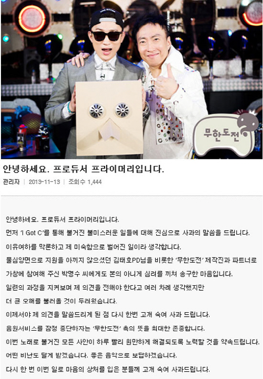 그러면서 "음원서비스를 잠정 중단하자는 '무한도전' 측의 뜻을 최대한 존중한다. 이번 노래로 불거진 모든 사안이 하루 빨리 원만하게 해결하도록 노력할 것을 약속드린다"며 "어떤 비난도 달게 받고 좋은 음악으로 보답하겠다"고 전했다