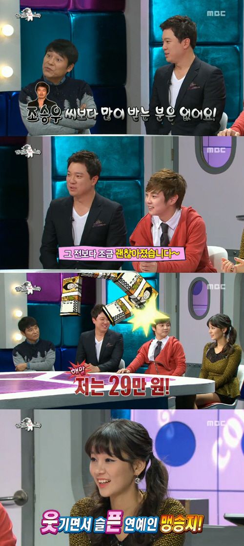그러자 MC김구라는 맹승지를 향해 "다른 사람에게 묻기 전에 본인의 출연료를 먼저 밝혀라"고 말하자, 그는 "출연료가 얼마인지는 전혀 모르겠다. 나는 '코미티에 빠지다' 회당 출연료가 29만원이다"고 솔직하게 말해 현장을 폭소케 했다.