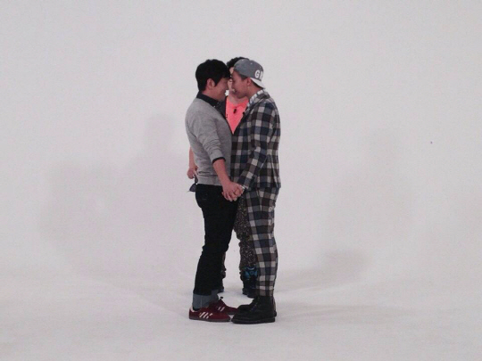 사진에는 정형돈과 지드래곤이 서로 손깍지를 꼭 낀 채 이마를 맞대며 다정한 분위기를 연출하는 모습이 담겨 있다. 특히 두 사람 모두 수줍은 듯 입가에 미소를 띠고 있는 모습이 눈길을 끈다.