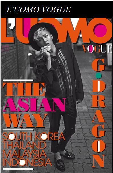 이탈리아 보그 남성판 '루오모 보그(L'UOMO VOGUE)'는 11월호 표지 모델에 지드래곤을 선정했다. 이는 반기문 UN 사무총장, 싸이에 이은 세 번째 한국인 표지 모델이기도 하다.