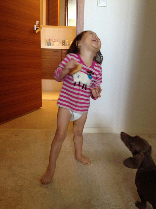 사진 속에는 분홍색 줄무늬 셔츠에 기저귀만 찬 추사랑양의 모습과 이 모습을 지켜보고 있는 강아지의 모습이 함께 담겨 있다.