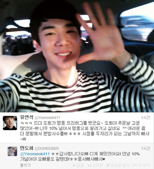 14일 유연석은 자신의 트위터에 "드디어 도희가 명동 프리허그를 했군요. 도희야 추운 날 고생 많았어! 나도 10% 넘어서 명동으로 달려가고 싶네요. 여러분 좀 더 분발해서 본방사수를! 시청률 두 자리가 되는 그날까지 빠샤!"라는 글을 게재했다.