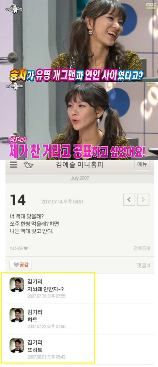 이어 "선배들의 말에 'XXX 구 여자친구입니다' 했더니 3사 개그맨들이 다 웃었다. 또 한마디 하라고 해서 '제가 찼습니다'라고 했다"며 "선배들이 장난으로 'XXX 잘되니까 배 아프지? 너 차여서. 다시 만나고 싶지?'라는 말을 해서 내가 찬 거라고 꼭 공표하고 싶었다"고 설명해 눈길을 끌었다.