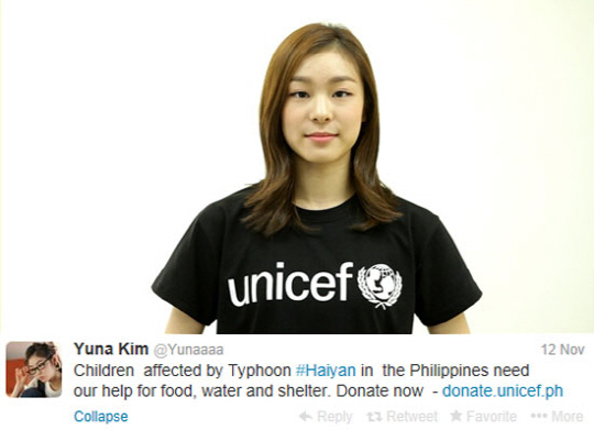 지난 12일에는 김연아가 트위터를 통해 태풍 피해를 입은 필리핀의 어린이들에게 도움을 줄 것을 호소하기도 했다.