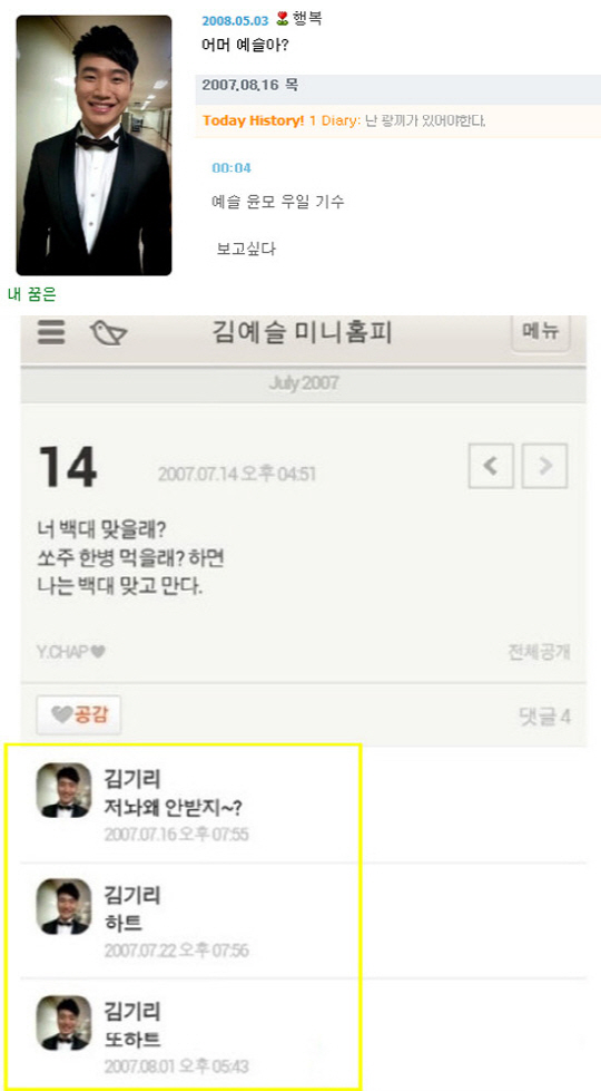 누리꾼들은 지난 2007년 맹승지 본명(김예슬)으로 개설 된 미니홈페이지를 조사, 김기리 '전화 왜 안받지?', '하트, 또 하트'라는 댓글을 포착했다.