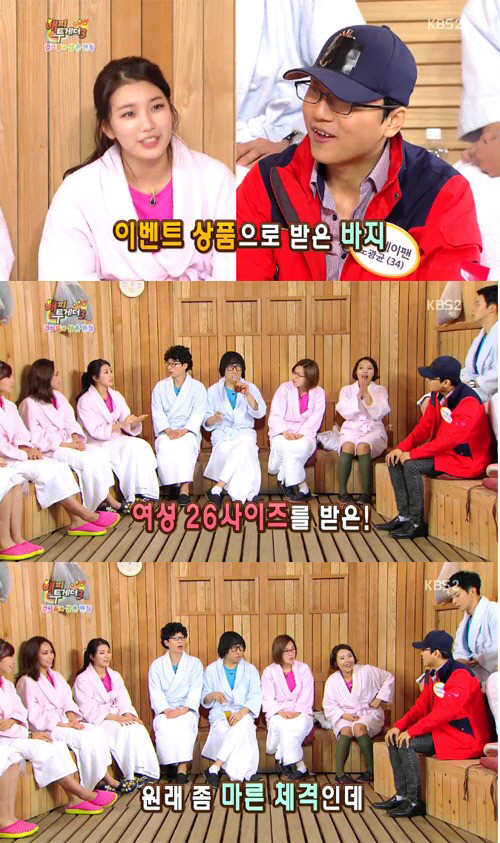수지의 골수팬이라고 밝힌 노광균씨는 "이 바지는 미쓰에이 공연에서 수지가 이벤트 상품으로 준 것"이라며 "여성용이지만 방송을 위해 특별히 살을 빼고 입고 나왔다"고 밝혔다.