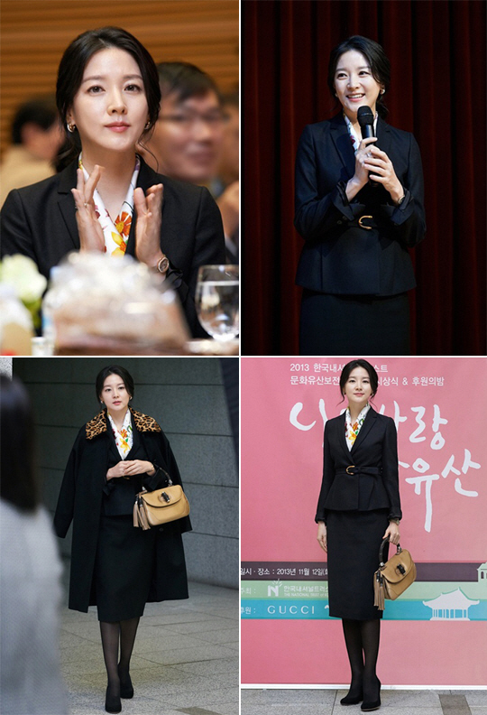 이날 시상식에 참석한 '나의 사랑 문화유산' 캠페인 홍보 대사 이영애는 구찌 블랙 스커트 정장에 화사한 플로럴 프리트 스카프, 은은한 골드 컬러 뱀부백으로 단아하면서도 우아한 스타일을 선보였다.