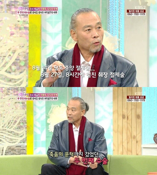 이날 이왕표는 "초기에 발견된 편인데도 수술을 두 번이나 했다. 8월 14일에는 담도 종양 절제술을 받았고, 이후 8월 2일에는 담도에서 전이된 암 때문에 췌장 수술을 받았다. 8시간이나 걸렸다. 그때 췌장의 1/3을 잘라냈다. 수술 후유증으로 대장과 간 동맥이 터지기까지 했다"고 말했다.