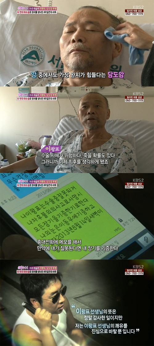 한편 이왕표의 담당의는 "이왕표의 병명은 하부담관암(담도암)이다. 완치 목표로 한 치료는 췌십이지장 절제술이라고 해서 외과 수술 중에서도 아주 큰 수술에 속한다"며 "수술 당시에 아주 위험했다. 수술하고 나서 중환자실에 갔을 때는 살 수 있을지 예측할 수 없을 정도로 위험했다. 다행히 우리가 생각했던 것보다는 잘 견디는 것 같다"고 말했다. <스포츠조선닷컴>