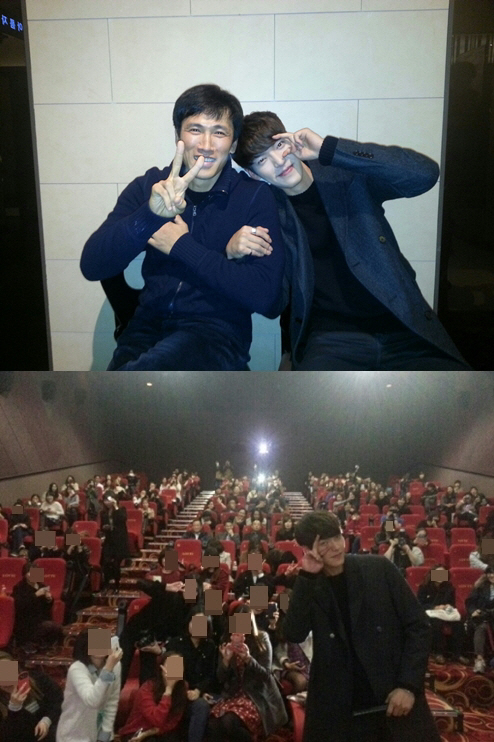 이벤트에 당첨된 참가자들을 유오성과 김우빈 옆자리에 앉아 이들과 함께 영화를 관람했다.