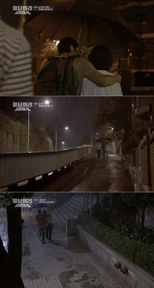 해당 게시물은 '응답하라 1994' 속 장면을 캡처한 것으로 쓰레기(정우)가 성나정(고아라)과 빙그레(바로)와 각각 우산을 쓰고 가는 모습을 비교했다.