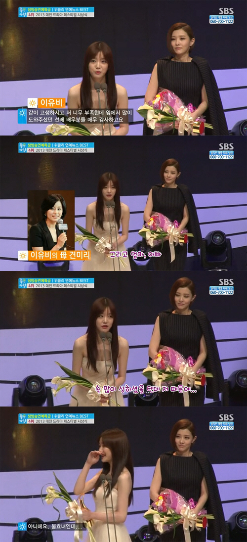 이날 신인상을 받은 이유비는 "같이 고생하시고 너무 부족한 절 옆에서 많이 도와주셨던 선배 배우분들 매우 감사하다"며 수상소감을 밝혔다.
