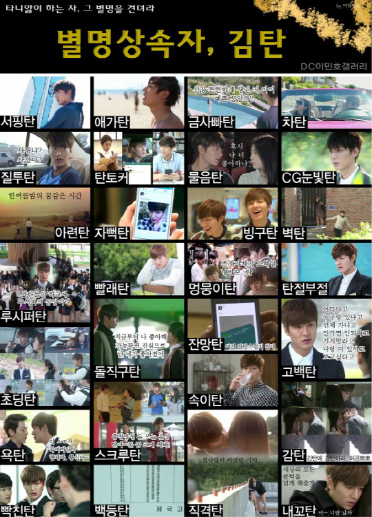 이민호는 최근 SBS 수목극 '상속자들'에서 제국그룹의 서자 김탄으로 출연하며 '탄 시리즈' 별명으로 화제의 중심에 서 있다. 시청자 게시판이나 디시인사이드 갤러리에 올라온 별명을 보면 멋지고 귀엽고 엉뚱한 매력의 김탄 캐릭터가 코믹하게 드러나 있다.